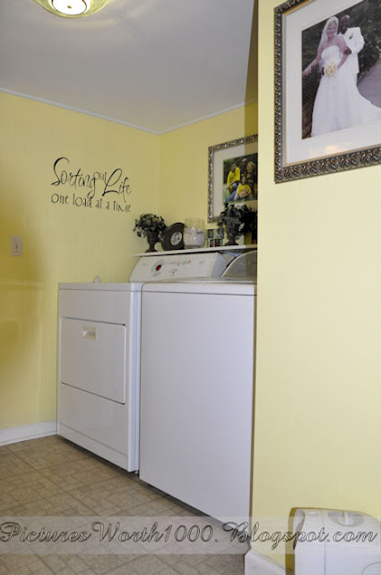 I been working on a yellow, white and silver theme in the laundry room. I want the room to feel bright and comfortable since it seems that we spend a lot of time in front of the washer and dryer.
